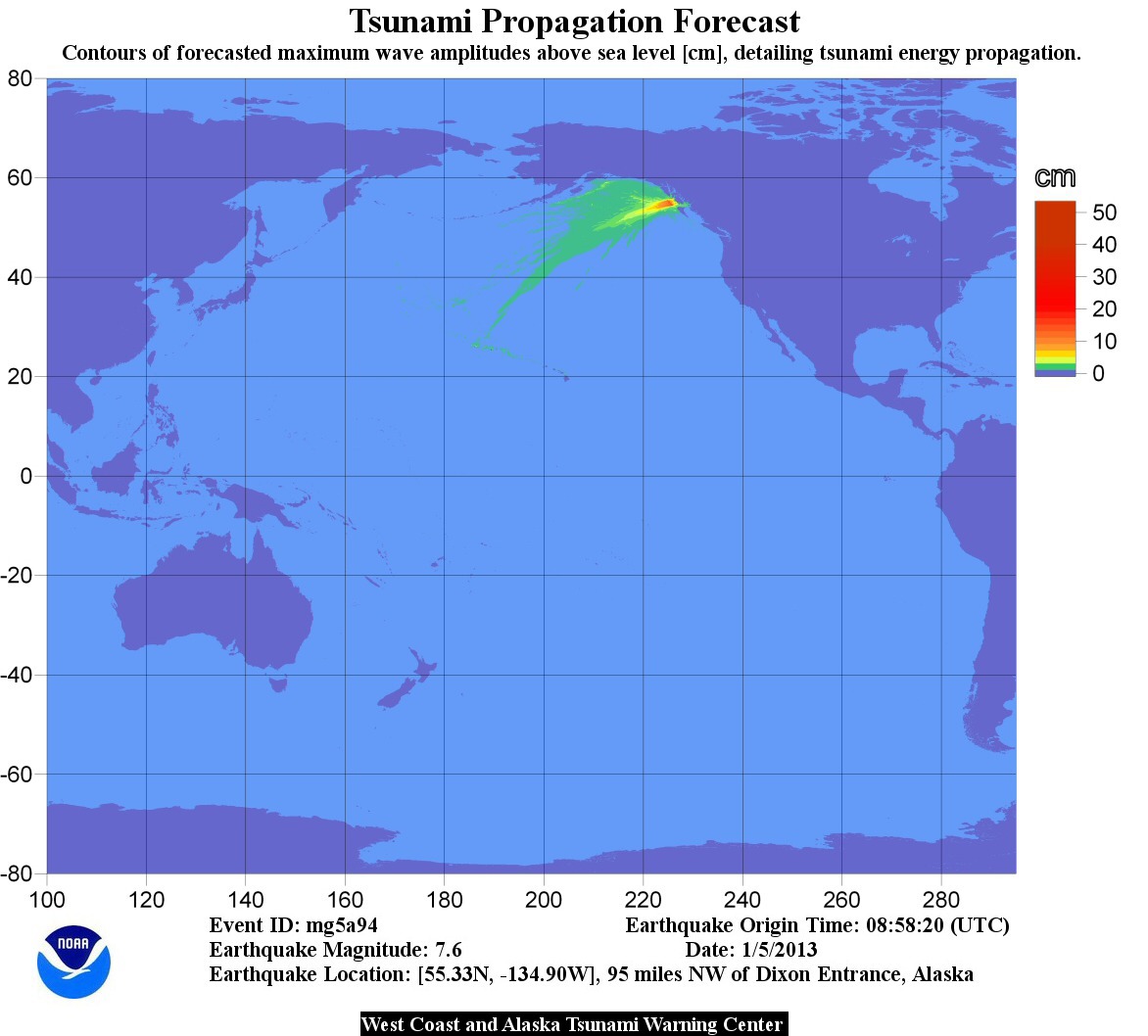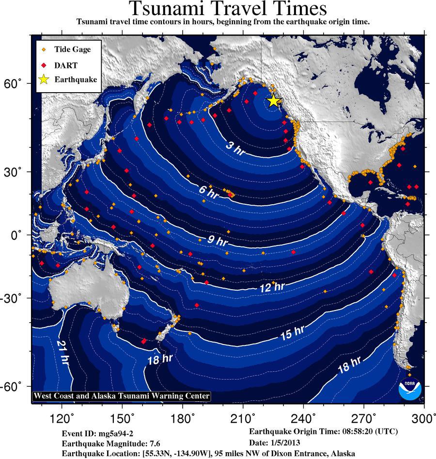 The tsunami Warning continues in effect for the coastal areas of British Columbia and Alaska from the north tip of Vancouver Island, British Columbia to Cape Suckling, Alaska (75 miles SE of Cordova).