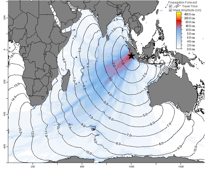 Listed wave heights are maximum amplitude in cm (above sea level). Observed Arrival time is the actual tsunami